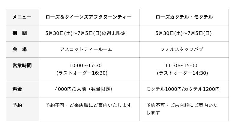 アスコットティールームにて「ローズ&クイーンズアフタヌーンティー」、フォルスタッフパブにて「ローズカクテル・モクテル」が登場いたします。ローズの装飾に彩られた華やかな店内でお食事を楽しめます。