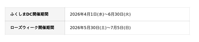 ふくしまデスティネーションキャンペーン(ふくしまDC)は、2026年4月1日(水)~6月30日(火)にわたってJRグループと県・市町村・地元の観光事業者などが一体となって各地域の魅力を発信する観光キャンペーンです。「しあわせの風ふくしま」をキャッチコピーとして、ふくしまDC期間中には、様々なメニューをご用意し、福島全体で皆様をお迎えいたします。ブリティッシュヒルズでは「ローズウィーク」を開催いたします。ぜひ福島に「来て」「見て」「食べて」「感じて」、幸せの風を感じてください。