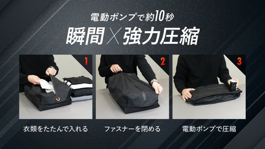 『EXCITECH COMPRESS POUCH + AIR PUMP』は、約1~3泊分の荷物が入る大容量サイズで、電動ポンプで約10秒*吸引するだけで、広々とした空間を確保しやすいのが特長です。