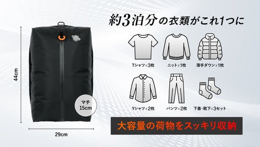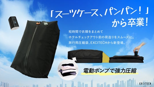 「スーツケース、パンパン!入らない!」は卒業。チェックアウト前の荷造りをスムーズに。約10秒で衣類をまとめやすい旅行用圧縮袋、EXCITECHから新登場。