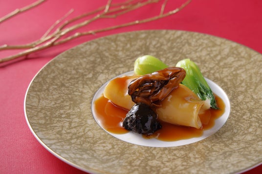 旧正月の祝賀料理「ローヘイ」 / 鮑、松茸、クコの実入り豚すね肉のスープ / 魚の浮袋と髪菜入り干し蠣の煮込み / 筍と豚バラ肉の煮込み / 大根と干し貝柱の蒸し物 / 海藻とガーリック仕立て / 葱油香る鴨肉とエシャロット入り煮込み麺 / 四宝茶のデザートスープ(紅棗・蓮の実・龍眼・うずら卵入り) / 中国春節の年糕餅