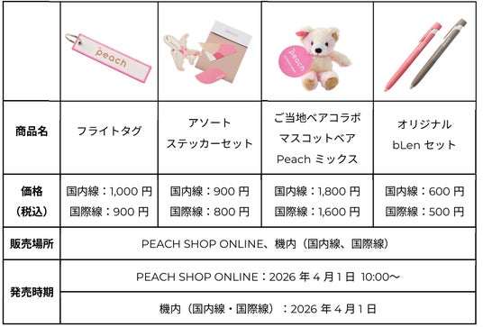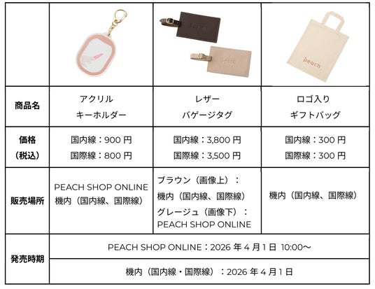 今回のブランドリニューアルに伴い、新しいブランドデザインのオリジナルグッズ7種の販売を Peach機内およびPeach公式オンラインショップ「PEACH SHOP ONLINE」にて開始いたします。 定番のフライトタグや職人が一つひとつ手作業で作る本革のバゲージタグ、お客さまの声から 誕生したPeachオリジナルグッズ初のギフトバッグなど、新しいPeachの魅力を日常や旅先 でも感じていただけるよう、細部までこだわった新グッズが登場します。ぜひ進化するPeachを ご一緒にお楽しみください。