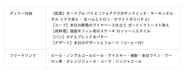 お食事には、イベント限定の特別ディナーをご用意いたします。前菜、スープ、肉料理、デザートまで、季節感を取り入れたコース仕立てでご提供。メインには「国産牛フィレ肉のステーキ ロッシーニスタイル」をご用意し、これから始まる能楽ショーへの期待を高める、華やかなディナータイムを演出いたします。ビール、ワイン、ウイスキー、焼酎、ソフトドリンクなどのフリードリンクとともに、特別な一夜の始まりをゆったりとお楽しみください。