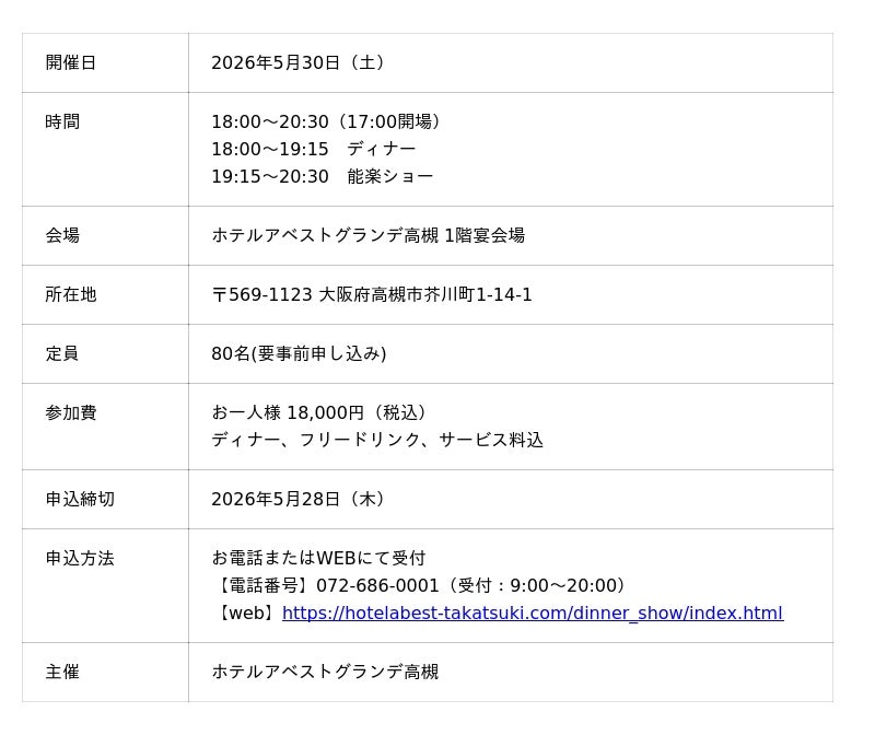 株式会社アベストコーポレーション(代表取締役:松山 みさお)が運営するホテルアベストグランデ高槻(支配人:石野 拓也、大阪府高槻市芥川町)は、2026年5月30日(土)、能楽師・味方 團氏、狂言師・茂山 忠三郎氏を迎え、解説付きで能楽を楽しめるプレミアムディナーショー「美食と能楽の夕べ」を開催いたします。