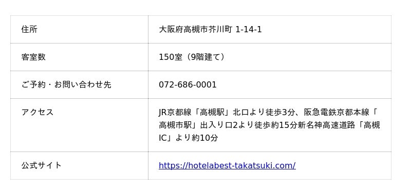 「ホテルアベストグランデ高槻」は、JR高槻駅から徒歩約3分、露天風呂やサウナ完備の大浴場、フィットネスジムなどの充実した設備が魅力のホテルです。ビジネスや観光に最適なスタンダードタイプのお部屋に加え、ワンランク上のエグゼクティブルーム、そして露天風呂の付いたスイートルームまで、全12タイプの幅広い客室をご用意しております。お一人様からご家族やグループでのご利用まで、あらゆる旅のスタイルに合わせて快適なご滞在をお楽しみいただけます。