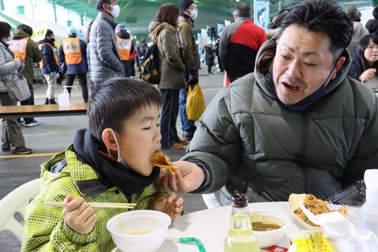 揚げたての鱈料理を頬張る来場者。宮古真鱈まつりは、家族で楽しめる冬の恒例イベントです。