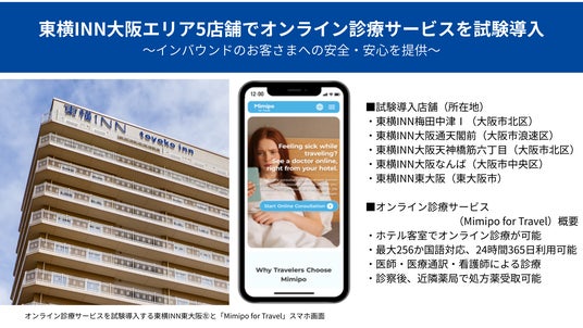 今回は全国展開を視野に、まずは大阪エリアの5店舗に限定して実施します。オンライン診療サービスが利用可能な環境を整えることで、インバウンドのお客さまへ安全・安心が提供できるかを検証していきます。また、多言語での医療案内がフロント業務の負担軽減にどの程度寄与するかも検証し、東横INNの最適なサービスのあり方を探ってまいります。