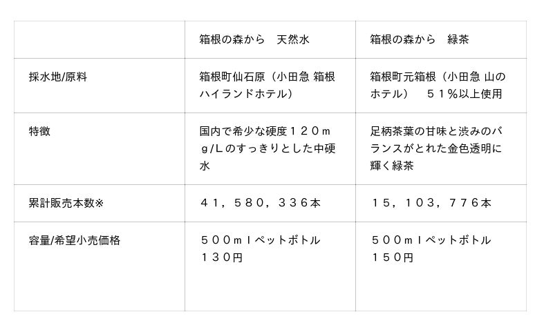「箱根の森から 天然水」は、富士箱根伊豆国立公園内の箱根町仙石原の地下水をボトリングした天然水です。日本国内でも希少な硬度120mg/Lの中硬水として健康的で飲み口の柔らかさが特徴です。姉妹商品の「箱根の森から 緑茶」は、芦ノ湖畔の「小田急 山のホテル」の地下水を51%以上使用して地元銘茶「足柄茶」の芳醇な香りを引き出すまろやかな味わいで、金色透明に輝く上品な緑茶です。