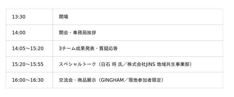 当日は3チームがそれぞれ約8ヶ月間の開発成果を発表し、ゲストによるフィードバックと質疑応答を行います。また、株式会社JINSで地域共生事業部を率いる白石 将 氏によるスペシャルトークも予定。発表会終了後は、現地参加者を対象とした交流会(16:00~16:30/GINGHAM)も開催します。